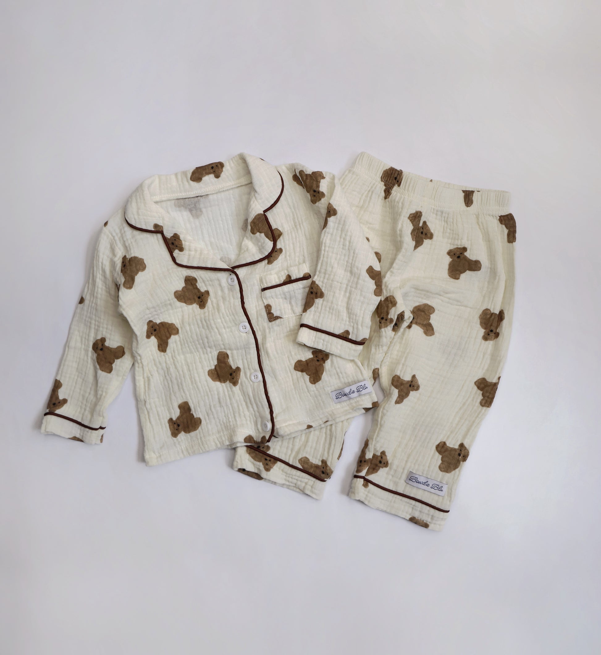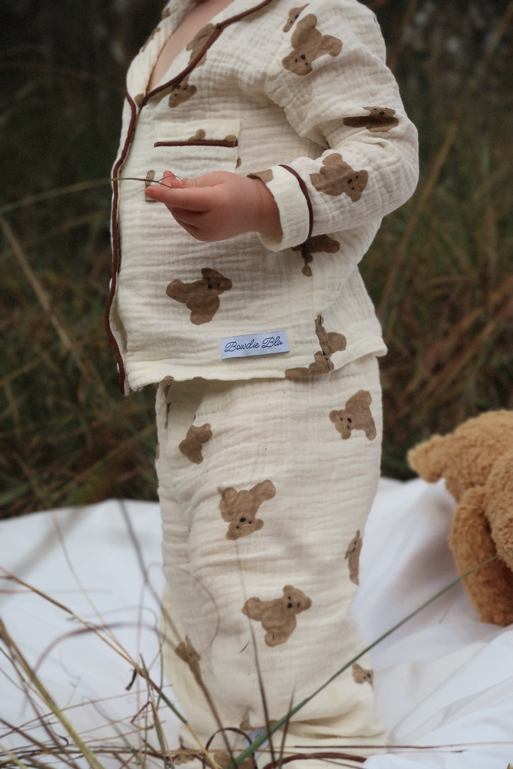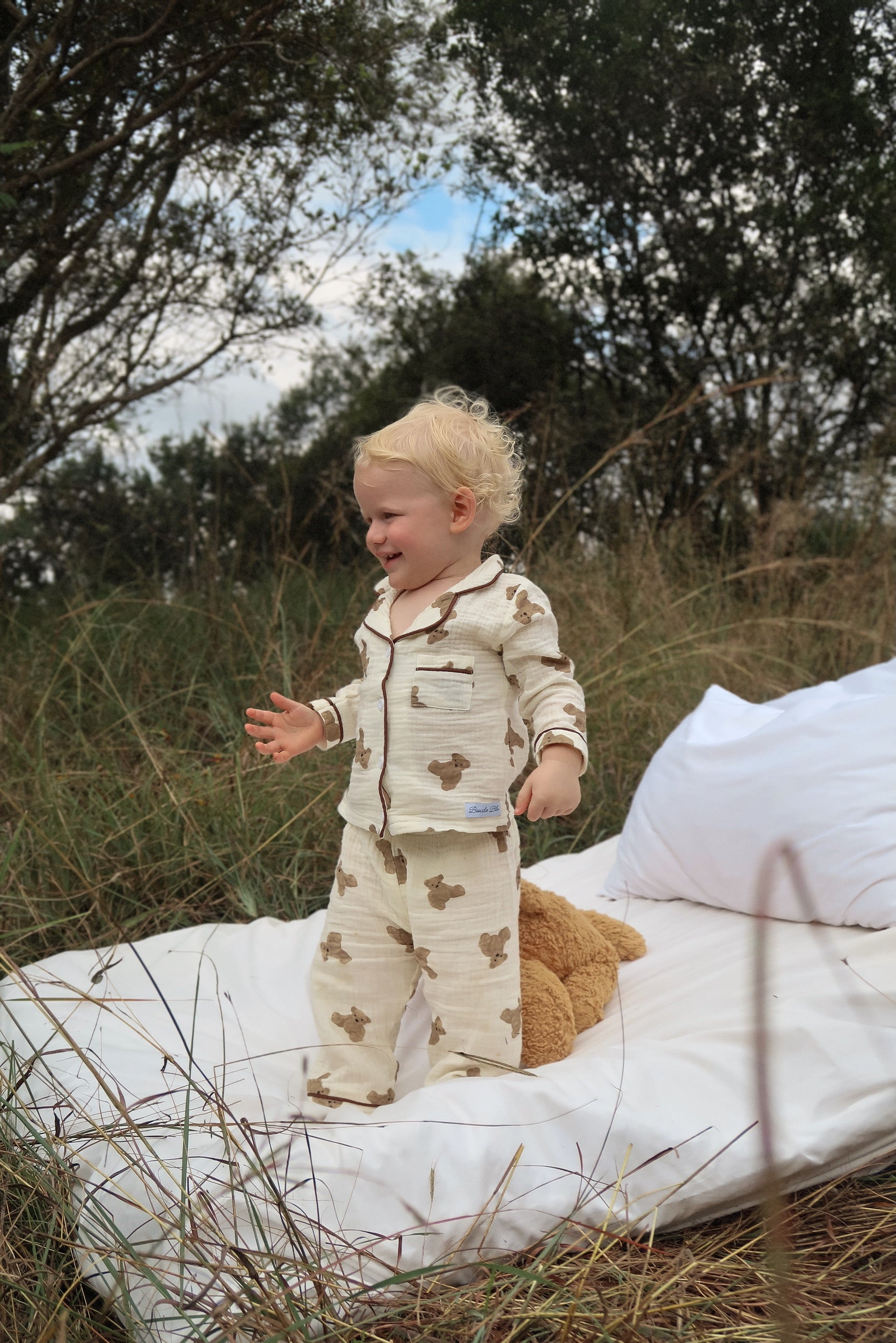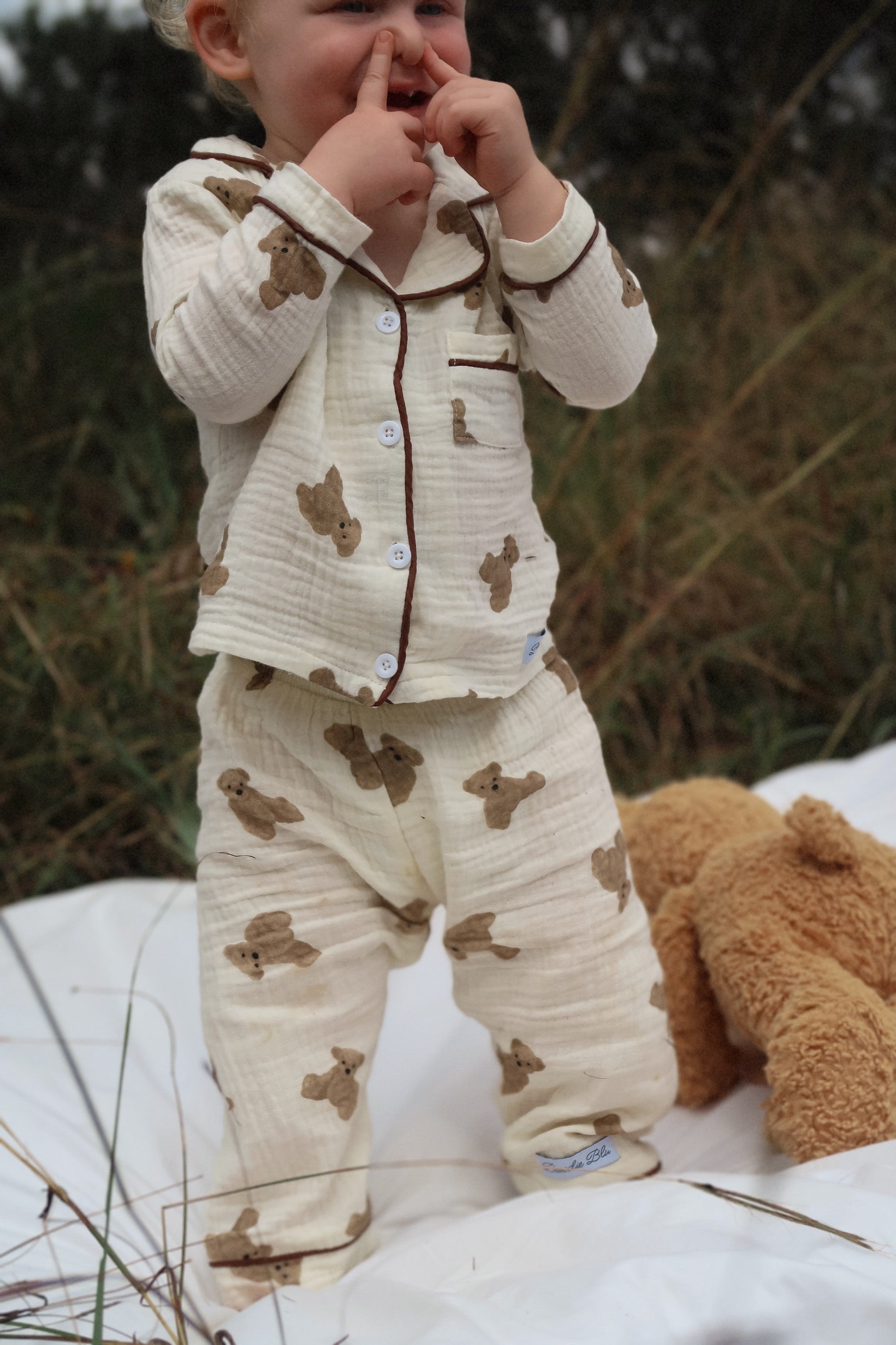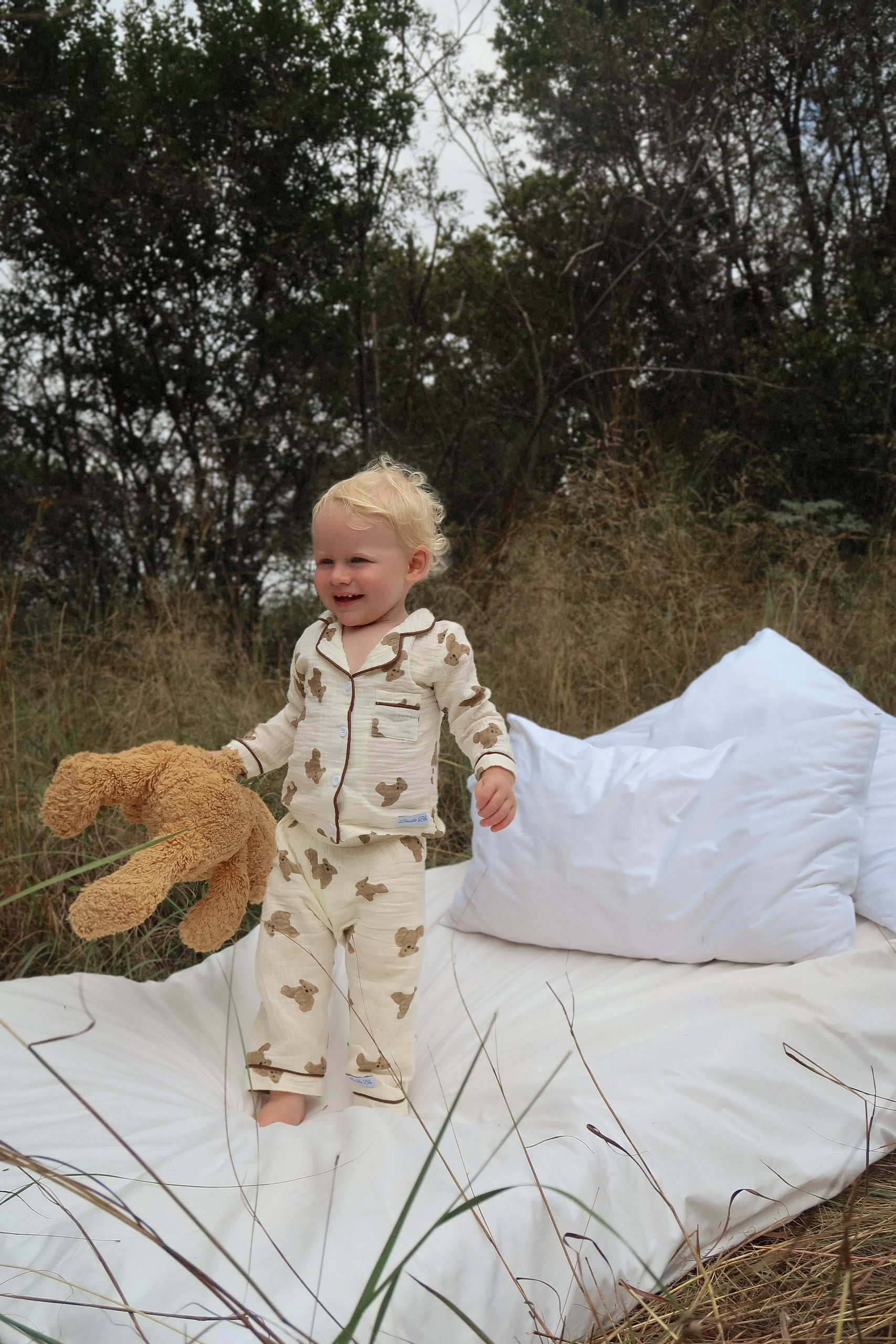 The coziest bedtime companion. Our ‘Teddy Wants a Cuddle’ set is made from buttery-soft muslin with a nostalgic teddy bear print that feels like a warm hug. The relaxed-fit top and elasticated bottoms are made for snuggles, stories, and slow mornings.